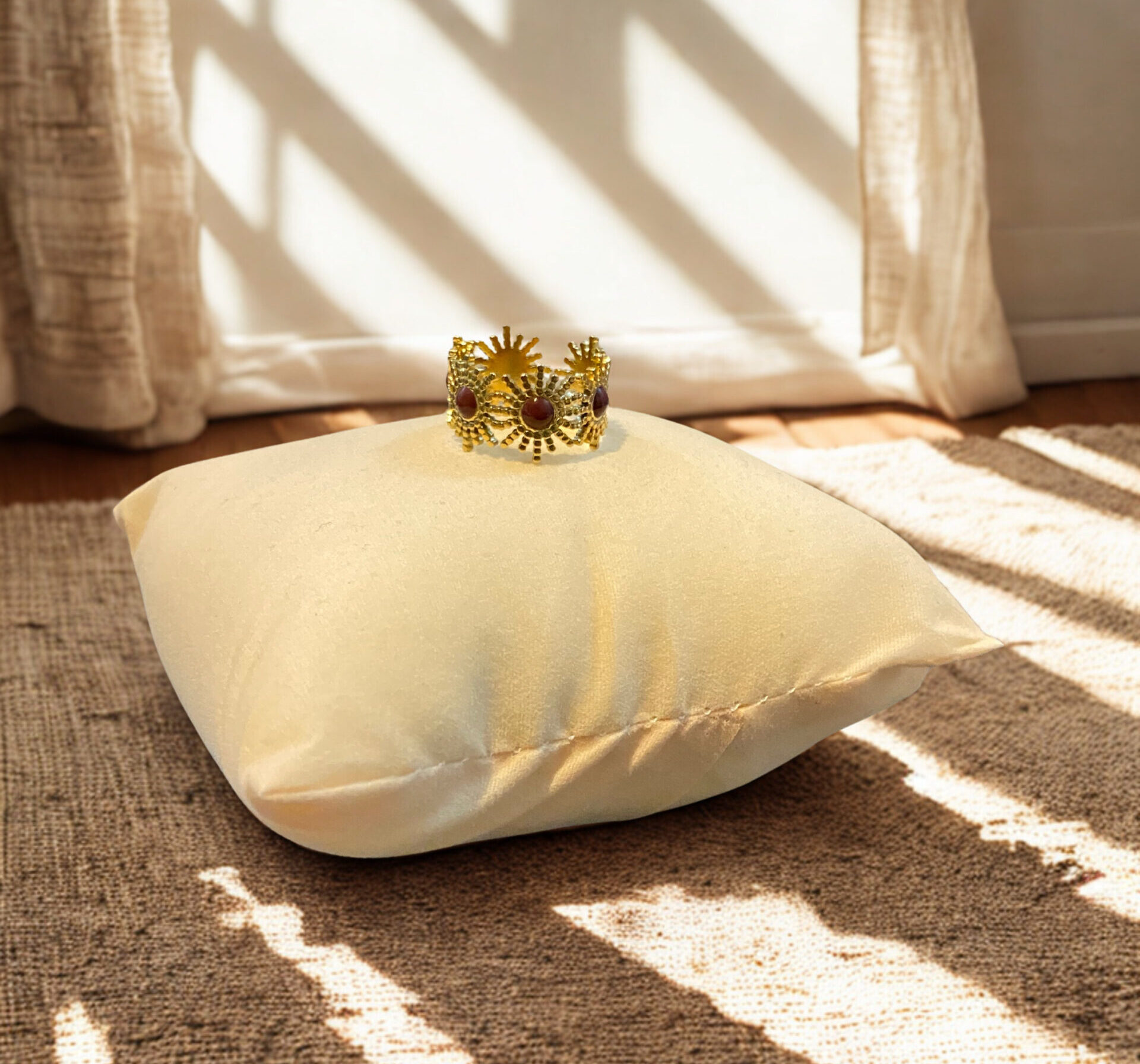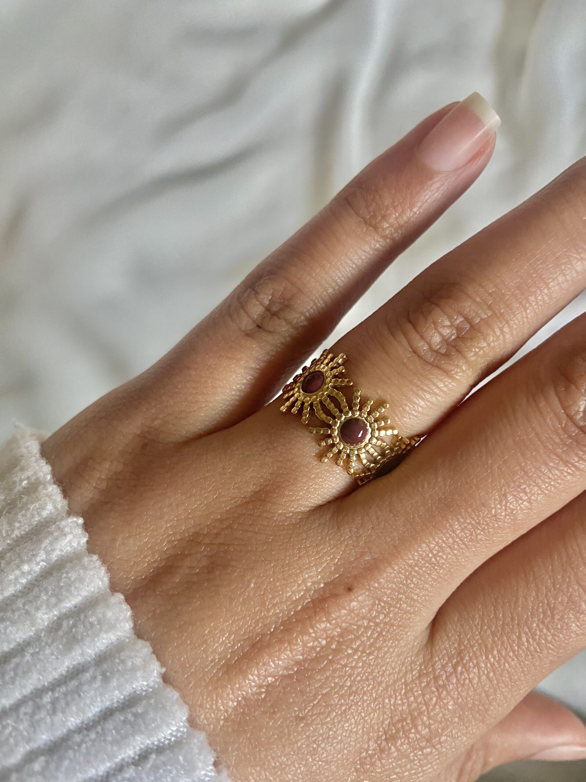 Bague couronne dorée sertie de pierres colorées. Majestueuse, vibrante et bohème.