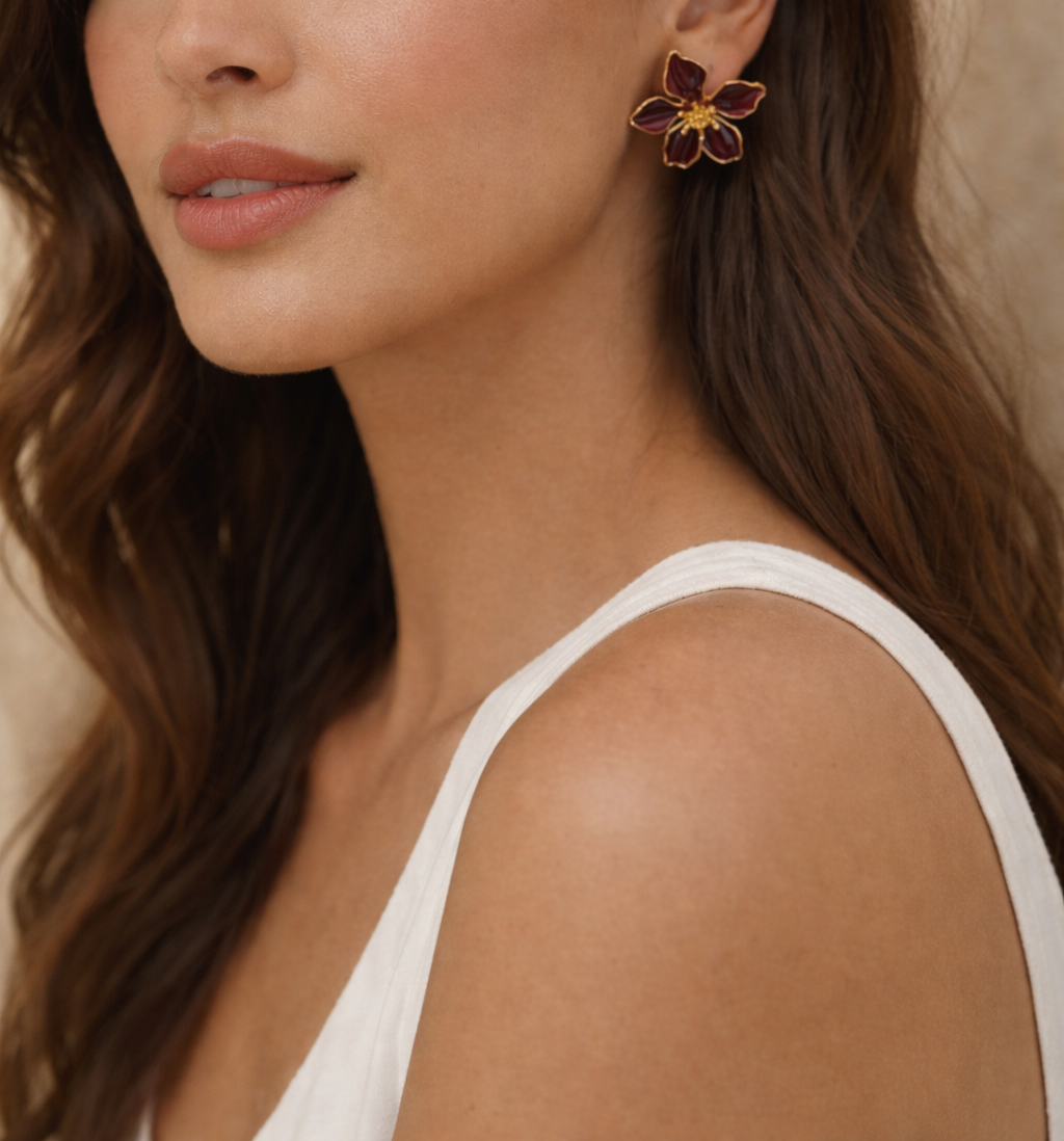 Boucles en forme de fleur aux pétales bordeaux, féminines et délicates, idéales pour une touche douce et originale.