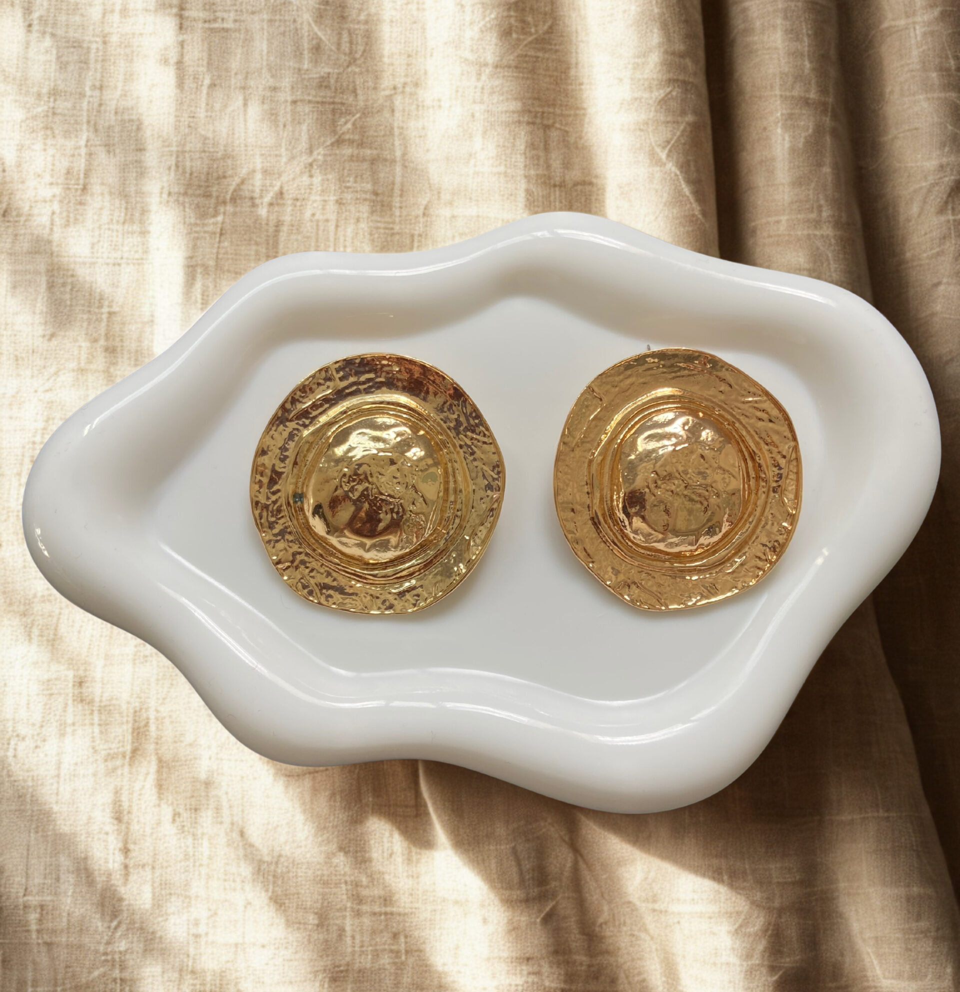 Boucles rondes dorées au relief travaillé, élégantes et lumineuses, parfaites pour sublimer un look minimal.