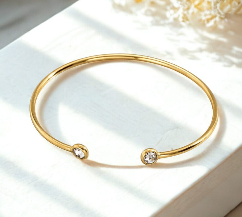Jonc doré fin sublimé par deux pierres lumineuses, une pièce minimaliste et raffinée qui apporte une touche d’éclat subtile au poignet.