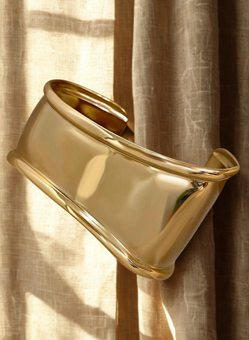 Manchette dorée au design épuré et brillant, une pièce chic et intemporelle à porter seule ou en accumulation.